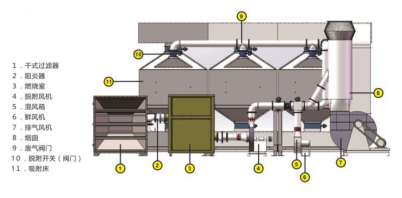 采用 “固定床吸附+RCO催化氧化設(shè)備”,其優(yōu)點為可靠、處理效率高,同時,不會產(chǎn)生二次污染,不會像其它處理方式如顆粒炭易發(fā)生自燃現(xiàn)象等,做到真正的節(jié)能、環(huán)保。采用系統(tǒng)自動脫附、增加蓄熱體、盡可能降低運行成本。